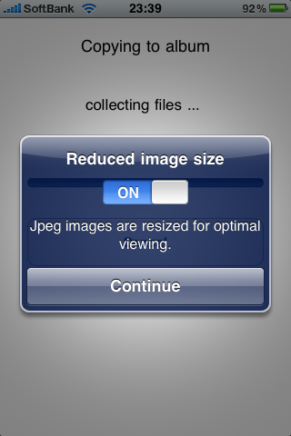 iPhone内のカメラロールにコピーする際には、画像を縮小する機能が使えるようだ。この機能は利用頻度が高そうだ。